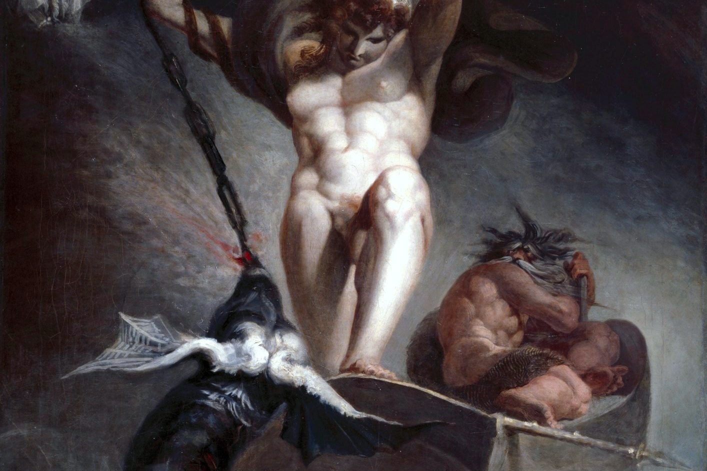 The world encircling serpent Jormungandr releases its hold upon its own tail and rises from the depths, making landfall spewing its venom against earth and sky, causing waves to crash that lets loose Naglfar, the ship of dead mens’ nails. The trickster god Loki too will break from his fetters, and will lead this vessel with his crew from Muspelheim, the realm of Fire, and will set sail from the East. From the South come more of the sons of Muspelheim, here lead by Surtr, the “black”, with his flaming sword brighter than the sun and cleaves the heavens in two, cracking and breaking the Bifrost, the rainbow bridge between heaven and earth, behind them.